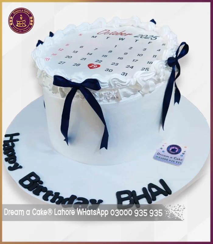 Customize White Calendar Theme Cake with Blue Ribbons in Lahore
