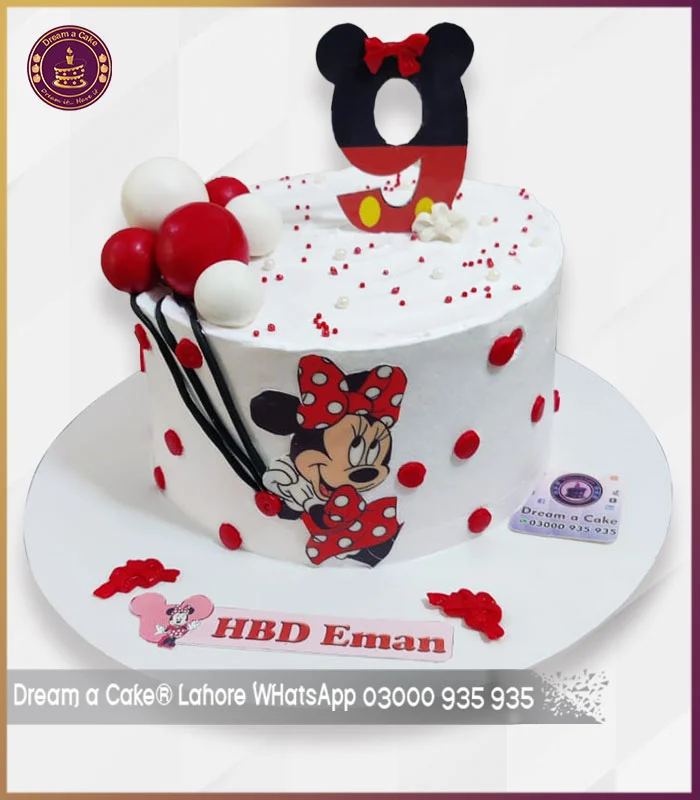 Celebrate your little princess’s special day with this delightful Minnie Mouse birthday cake from Dream a Cake Lahore. Adorned with Minnie’s iconic red bow, polka dots, and cute balloon accents, this charming cake is perfect for a 9th birthday celebration or any Minnie-themed party. The beautiful red and white color combination adds a playful touch, while the flawless finishing showcases expert craftsmanship and creativity.